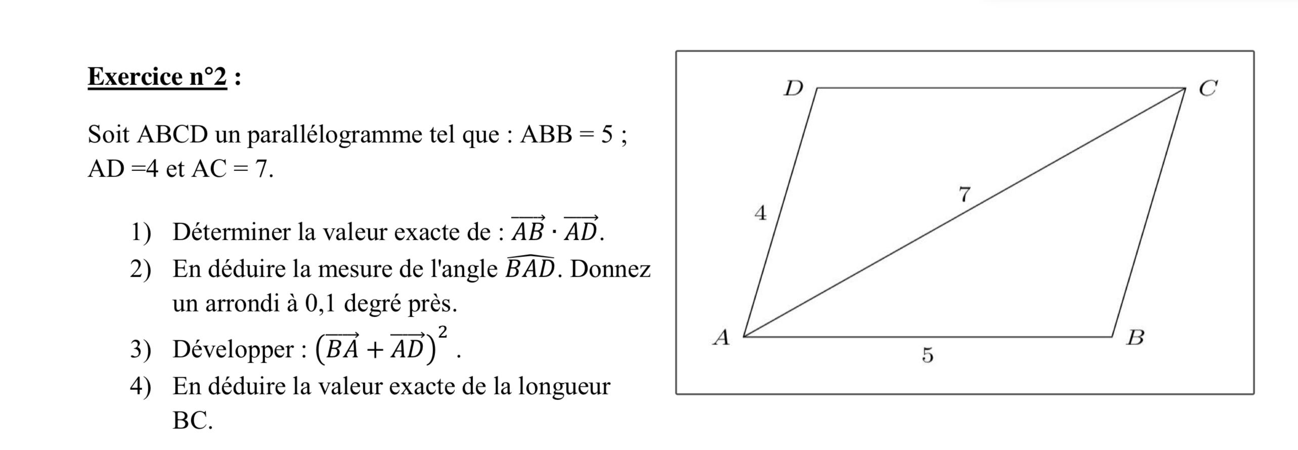Dans la première question, j'ai utilisé la formule u . v = 1/2 ( ||u ||² + ||v|| ² − ||u − v|| ² ), et la formule 2(AB²+BC²)=AC²+BD² pour calculer BD. Et j'ai alors trouvé que le produit scalaire donnait 4. Dans l'exercice 2, j'ai donc utilisé la formule AB . AD = AB x AD x cos(BAD), pour trouver l'angle BAD. Néanmoins, en prenant mon résultat de la question 1, la réponse était de 0.99..., ce qui ne fait pas de sens. J'ai donc décider de chercher BAD, en trouvant BAC puis DAC. Pour les deux angles, j'ai utilisé la formule BC² =AB² +AC² +2xABxACx cos (BAC). Le résultat final de l'addition des deux calculs m'a donné environ 78,4º, ce qui correspond bien au croquis présenté sur le sujet. Mais comme le sujet l'indique, il faut trouver la réponse grâce au produit scalaire calculé dans la question 1, et de cette manière je n'y arrive pas.