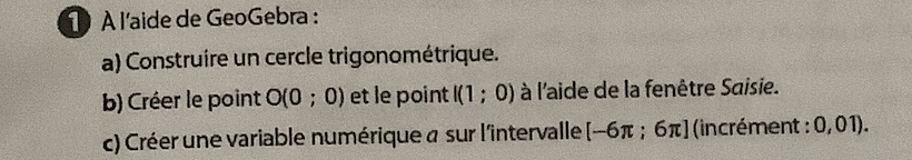 Saisie : c=Cercle(O,1)nombre a entre -6pi et 6pi (pour avoir le pi en GeoGebra, tu appuies sur les touches Alt et P en même temps) avec un incrément de 0,01: Tu devrais obtenir le fichier suivant que tu peux télécharger : Je te laisse poursuivre.