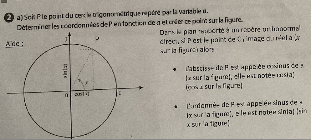 Saisie : P=(cos(a),sin(a))Bonne continuation