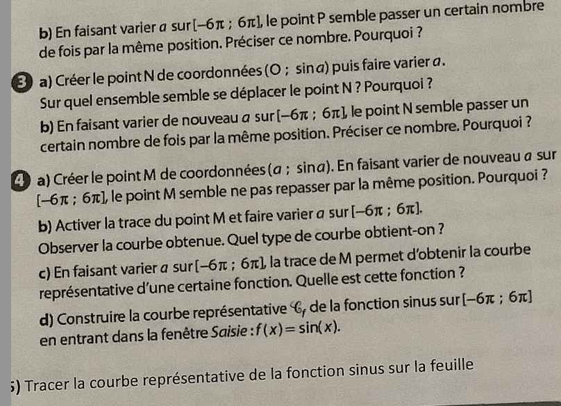 nombre a entre -6pi et 6pi (pour avoir le pi en GeoGebra, tu appuies sur les touches Alt et P en même temps) avec un incrément de 0,01: Tu devrais obtenir le fichier suivant que tu peux télécharger : Je te laisse poursuivre.