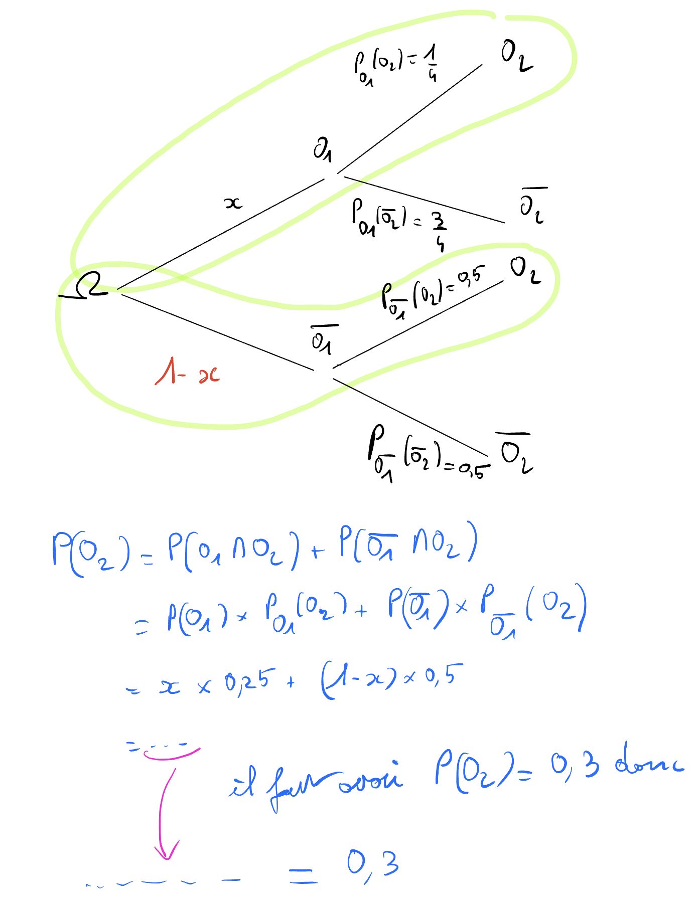 Aussi, la dernière question de l'exercice 3, me pose problème. Je n'arrive pas à résoudre l'équation qui permettra de trouver la valeur de x. Je sais que P(O1) + P (O1)barre = 1 et que P(O2) = P(O1)xPO1(O2)+P(O1)barrexPO1barre(O2) mais impossible pour moi d'aller plus loin.