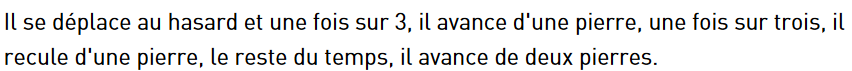 OK sos maths et merci pour vos réponses. J'ai ouvert le lien et lancé le programme...vraiment vous allez me trouver stupide mais je ne comprends pas pourquoi une fois de plus, nous avançons de x+2 dans 1/3 des cas, de x+1 dans 1/3 des cas et de x+1 dans 1/3 des cas au lieu de x+1, x et x-1...