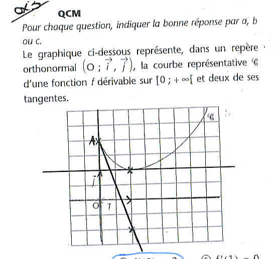 1) f'(1)=0 car graphiquement 1 a pour tangente la courbe d'équation x=1 fonction constante donc f'(1)=0