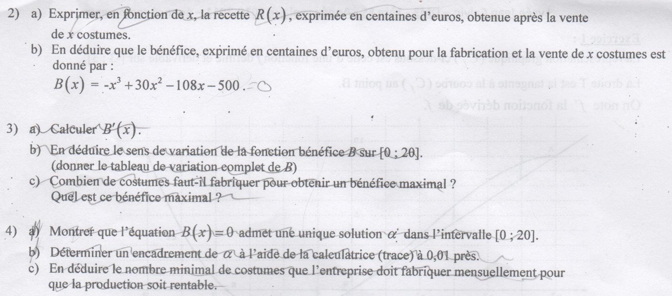 b)En déduire que le bénéfice,exprimé en centaines d'euros,obtenu pour la fabrication et la vente de X costumes est donné par: B(X)=-X^3+30X²-108X-500.
