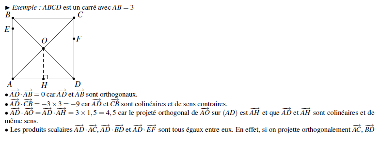 Si deux vecteurs sont non colinéaires , comme les vecteurs AO et AD, on peut obtenir le produit scalaire des deux vecteurs en projetant orthogonalement l'un des vecteurs sur l'autre.