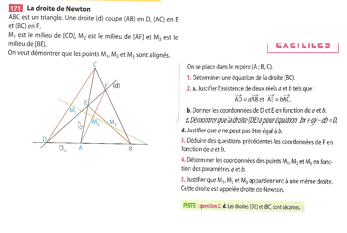 Bonsoir Ophélie, Tu as une indication pour la question 2d) : les droites (DE) et (BC) sont sécantes. Une équation de (BC) est\(x+y=1\), ou encore, \(y=-x+1\).