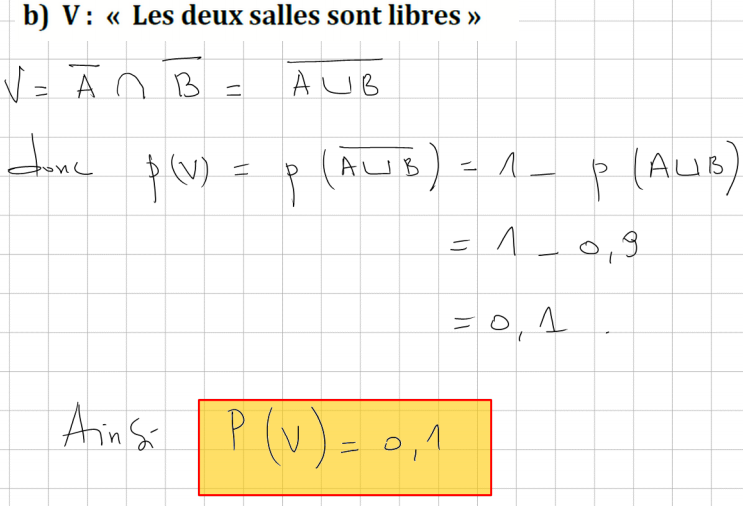 l'événement \(V=\overline{A\cap B}\) est l'événement contraire de \(A\cap B\) qui est "les deux salles sont occupées".