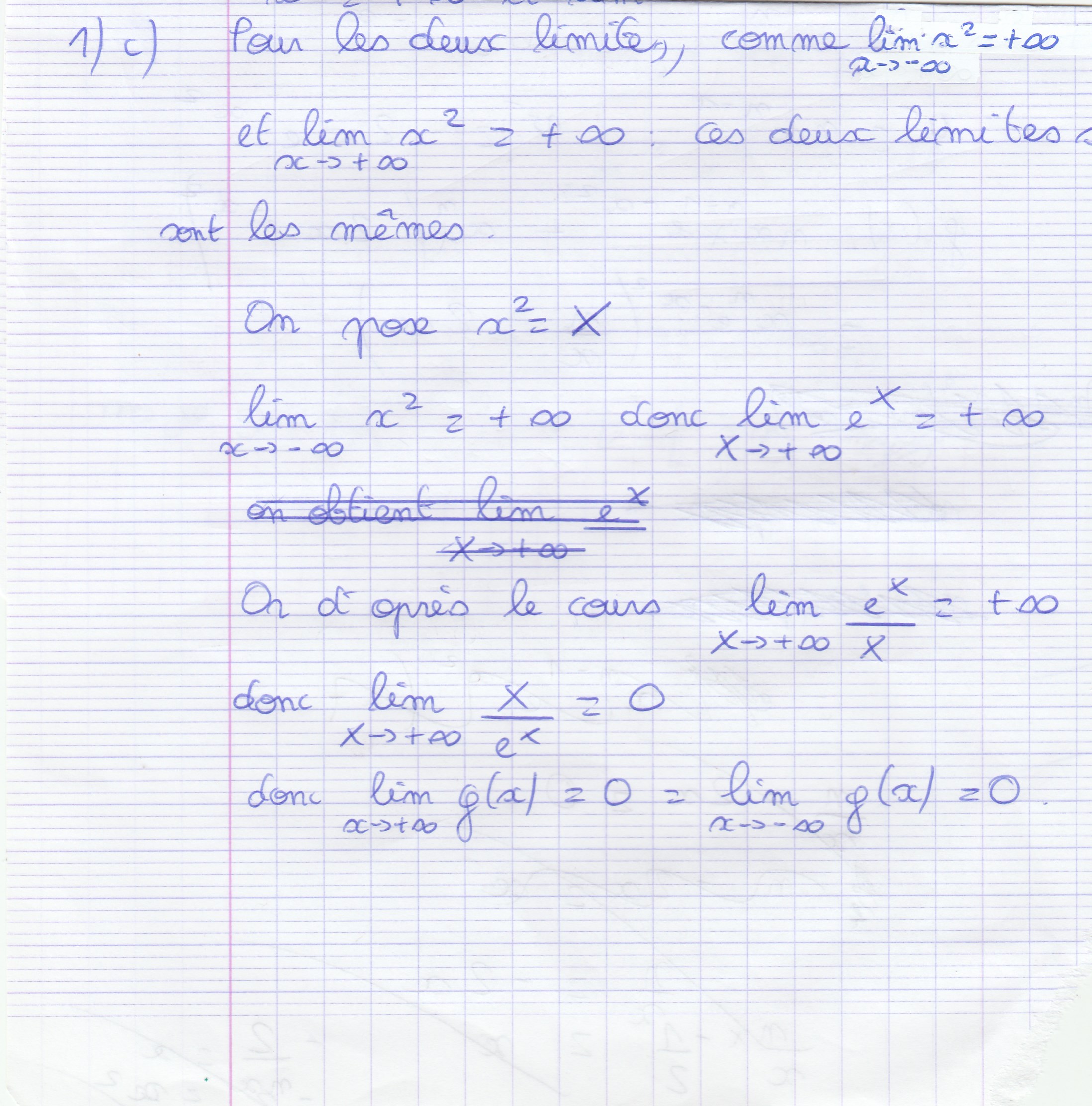 Pour la question 1 c) , je n'arrive pas à trouver les bonnes limites. En effet, je trouve comme limites en + et - infini ; + infini au lieu de 0, comme l'indique la courbe.
