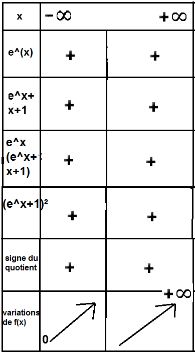 Je te rappelle juste que la dérivée de ta fonction est égale à \(f^,(x)=\frac{e^xg(x)}{(e^x+1)^2}\) et qu'il faut donc une ligne pour le signe de \(e^x\), une ligne pour le signe de \(g(x)\), une ligne pour le signe du dénominateur \((e^x+1)^2\) et enfin une ligne pour le signe de la dérivée.
