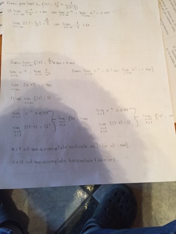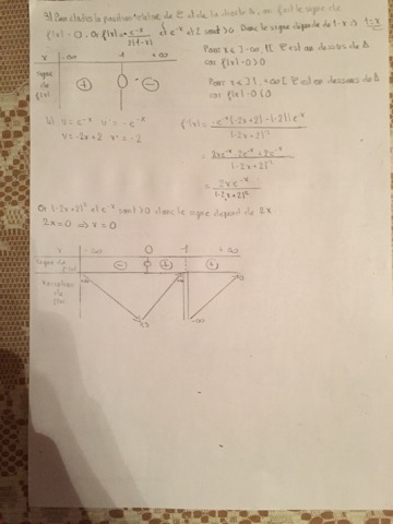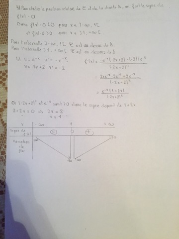 si ta fonction est \(f(x)=\dfrac{e^{-x}}{-2x+2}\) alors ta dérivée est donc \(f'(x)=\dfrac{-e^{-x}\times (-2x+2)-e^{-x}\times (-2)}{(-2x+2)^2}\) donc en développant, tu as des simplifications \(-e^{-x}\times (-2x+2)-e^{-x}\times (-2)=2xe^{-x}-2e^{-x}+2e^{-x}=2xe^{-x}\) qui change de signe en 0, étant négatif avant 0, et positif après (signe de \(x\)). IL faut donc revoir ton tableau de variation qui doit comporter 3 variations (à cause de la valeur interdite).