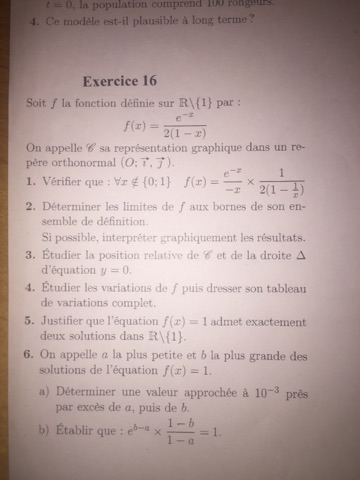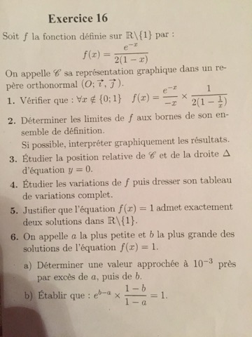 Pour la dernière question, il faut exploiter le fait que \(f(a)=1\) et \(f(b)=1\), cela signifie que \(\dfrac{e^{-a}}{2(1-a)}=1=\dfrac{e^{-b}}{2(1-b)}\)