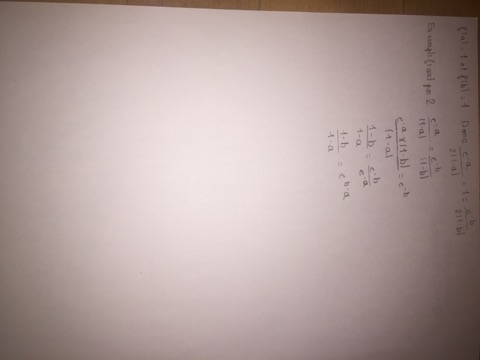 Tu peux simplifier par deux les deux fractions égales et il te reste : \(\dfrac{e^{-a}}{(1-a)}=\dfrac{e^{-b}}{(1-b)}\)