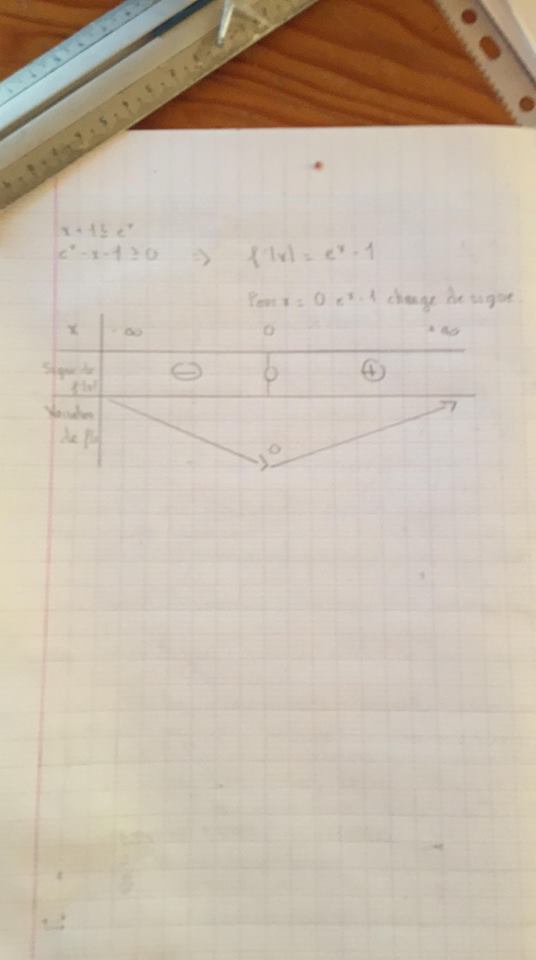 D'après le tableau de variation trouvé, il est clair que f admet un minimum qui vaut 0 pour \(x=0\), donc : \(f(x)>=0\) pour tout x réel.