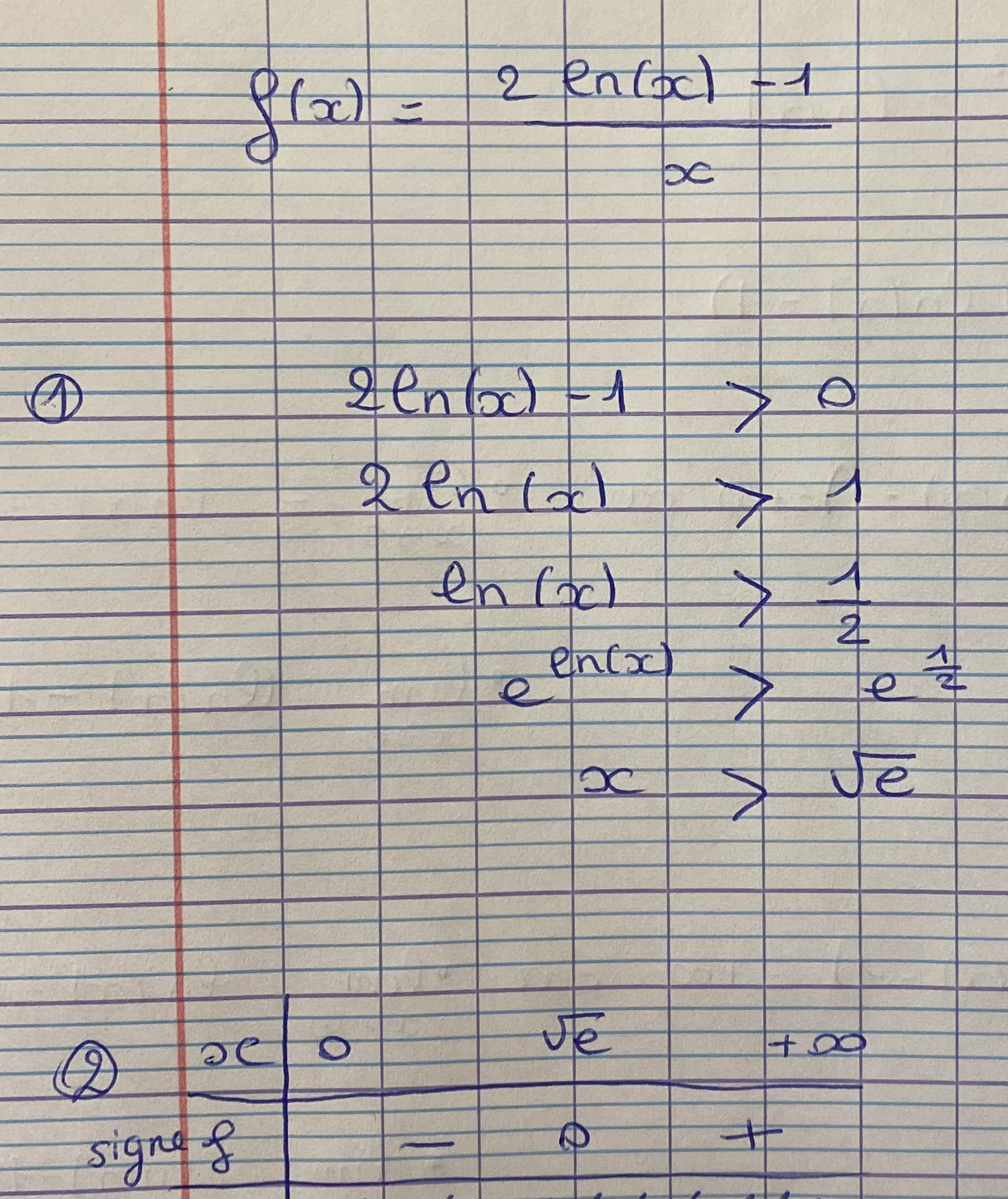 on ne te demande que le tableau de signes de \(f(x)\), qui n'est pas une dérivée donc tes variations en-dessous n'ont pas lieu d'être, surtout qu'elle sont fausses car ta fonction est strictement croissante sur \(]0\,;\,+\infty[\).