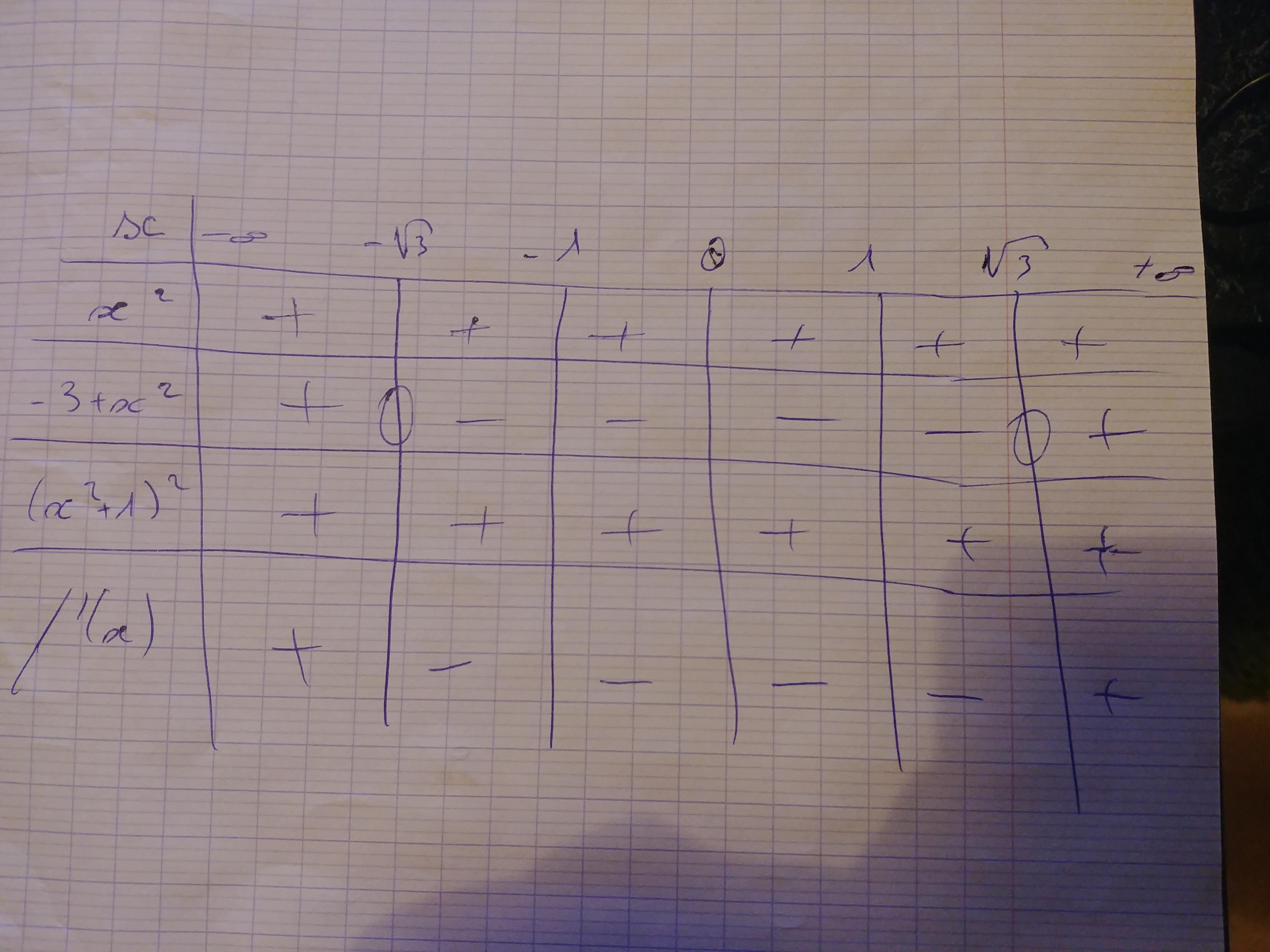 Tu dois avoir dans ton tableau \(-\infty ; -\sqrt{3} ; -1 ; 0 ; 1 ; \sqrt{3} ; +\infty\)