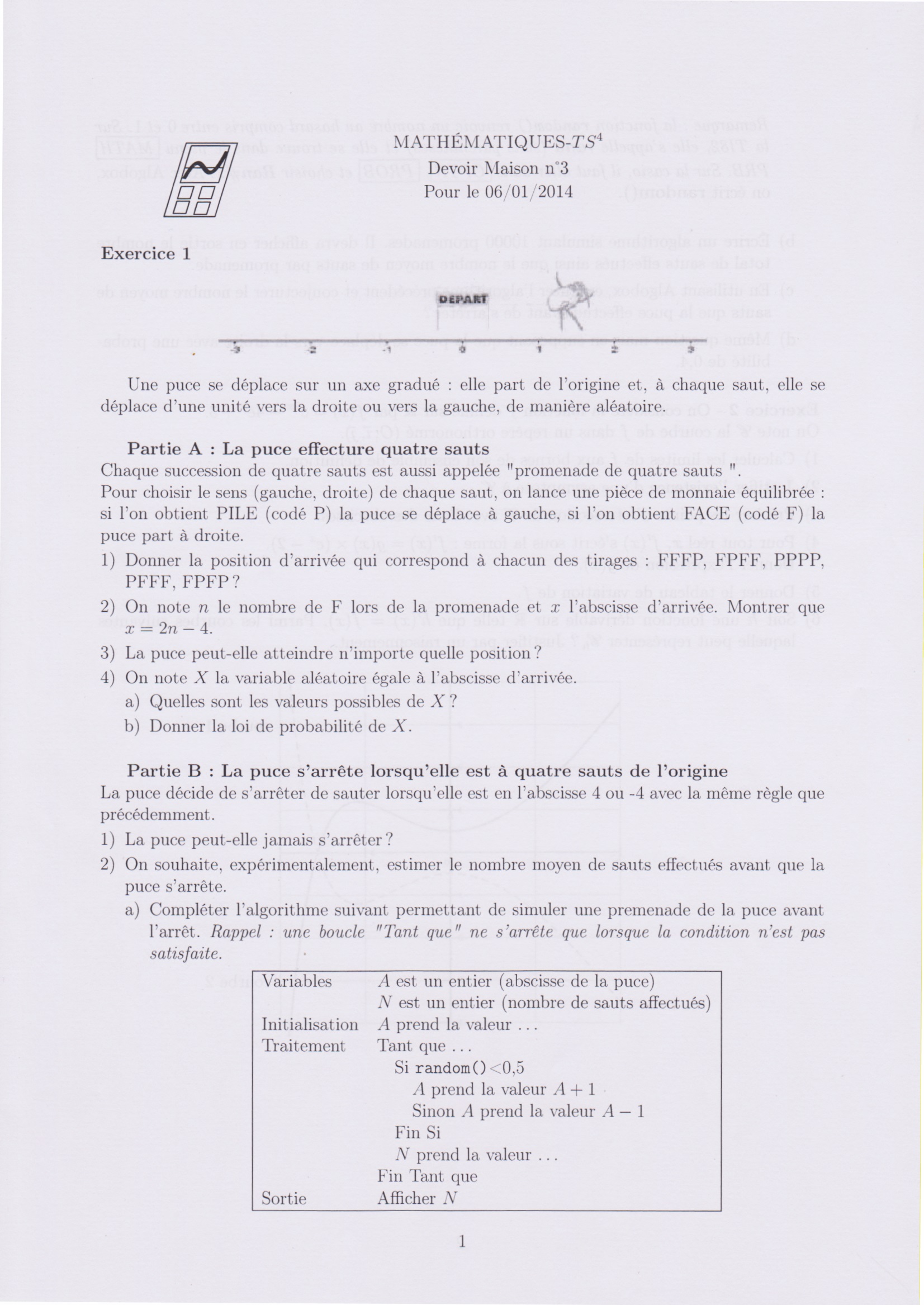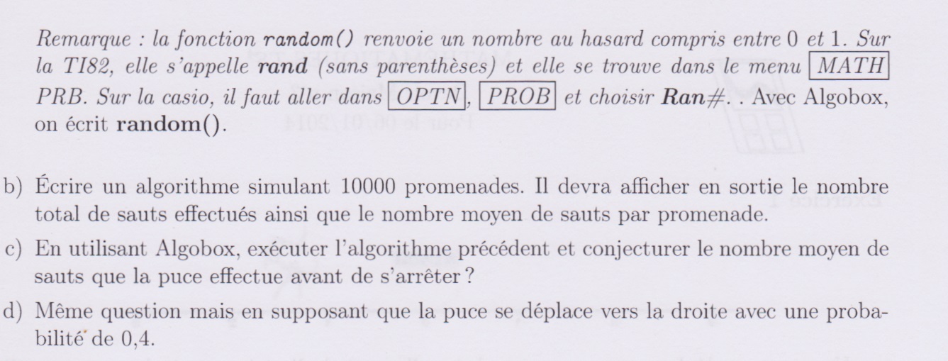 J'ai un DM à rendre pour la rentrée. Le sujet est en pièce jointe. La partie A est très simple et je l'ai terminée. mais je bloque sur la partie B déjà la première question que je n'arrive pas à justfier mon bon sens me dit que la proposition est fausse et que la puce s'arrête... Puis l'algorithme en 2a) est simple même si je pense qu'il comporte une erreur (il faut aussi initialiser navec 0 comme valeur pour obtenir le nombre de sauts). Mais la question 2b) est pour moi impossible à comprendre. Je pense écrire un algorithme avec une boucle pour afin de répéter les promenades mais le promenade doit forcément avoir un nombre précis de sauts qui n'est pas donné mas on nous demande justement de le déterminer . Je ne comprends pas.