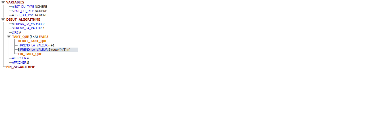 De plus l'algorithme demande de faire afficher 2 nombres, n et S et un seul est affiché. C'est pourquoi je pense que ton algorithme est à revoir.