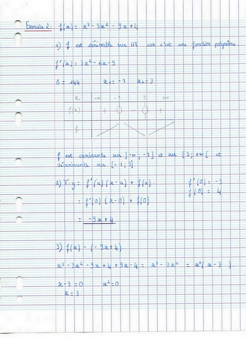 Ci-joint le scann de mon exercice, terminé ainsi que la courbe et les tangentes citées dans l'exercice. Pourriez vous me corriger si nécessaire et si nécessaire également corriger mes erreurs de rédaction ? Merci Beaucoup !