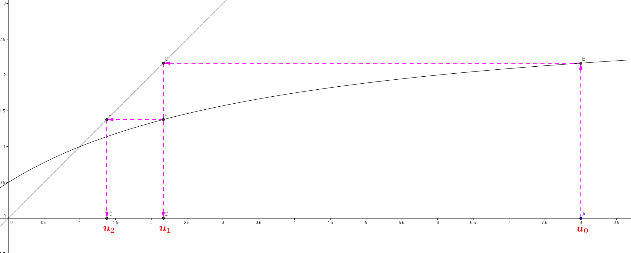 Si on prend pour exemple \(u_{n+1}=\frac{3u_n+2}{u_n+4}\), alors la fonction associée est \(f(x)=\frac{3x+2}{x+4}\), Je te laisse réfléchir à la façon dont j'ai utilisé le graphqiue pour construire les premiers termes de ta suite.