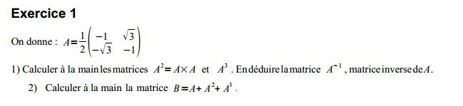 Ensuite je dois la multiplier par elle même, donc (-1/2)²; (racine(3)/2)²;(-racine(3)/2)²; (-1/2)² mais je crois que ça n'est pas la bonne méthode car ça ne me donne pas comme ma calculatrice.. :)