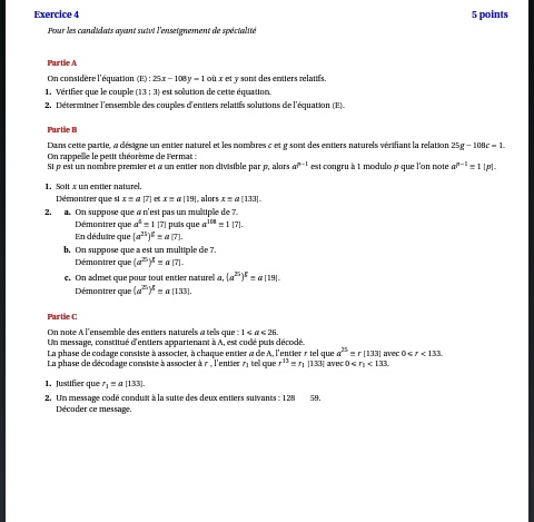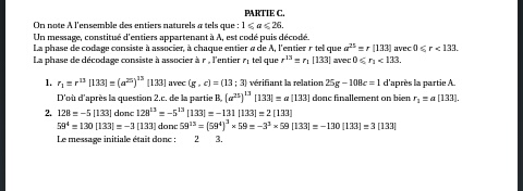 Bonjour, je suis actuellement en pleine révision pour le bac blanc, j'ai donc essayé de faire quelques exercices de spécialité pour me remettre à niveau. J'ai donc choisi le sujet de Polynésie 2012 pour m'entraîner. J'ai réussi à faire tout le sujet sans difficultés, jusqu'à la dernière question, qui pourtant semble être très simple mais même en regardant le corrigé sur apmep je n'ai pas compris la méthode qu'ils ont utilisé pour décoder ces deux nombres. Est ce que quelqu'un pourrait m'expliquer plus en détail la méthode pour décoder ces deux nombres obtenus