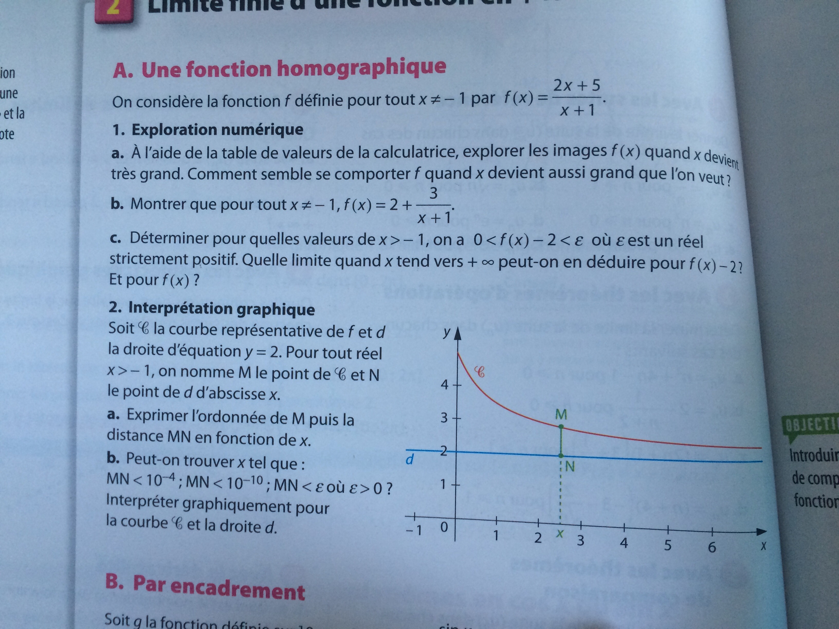 avant, on a montré que \(f(x)=2+\frac{3}{x+1}\) donc\(f(x)-2=\frac{3}{x+1}\)