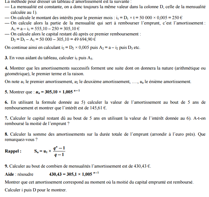 4. Montrer que les amortissements successifs forment une suite dont on donnera la nature (arithmétique ou