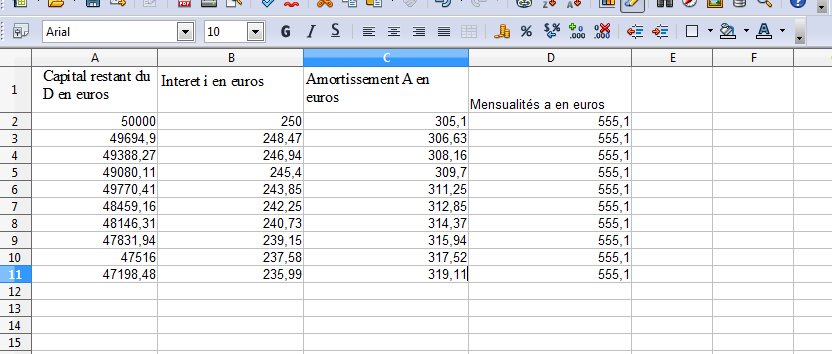 7) As tu essayé de refaire le fichier tableur, car tu devrais alors avoir cette réponse : Capital restant dû = capital précédent - amortissement précédent