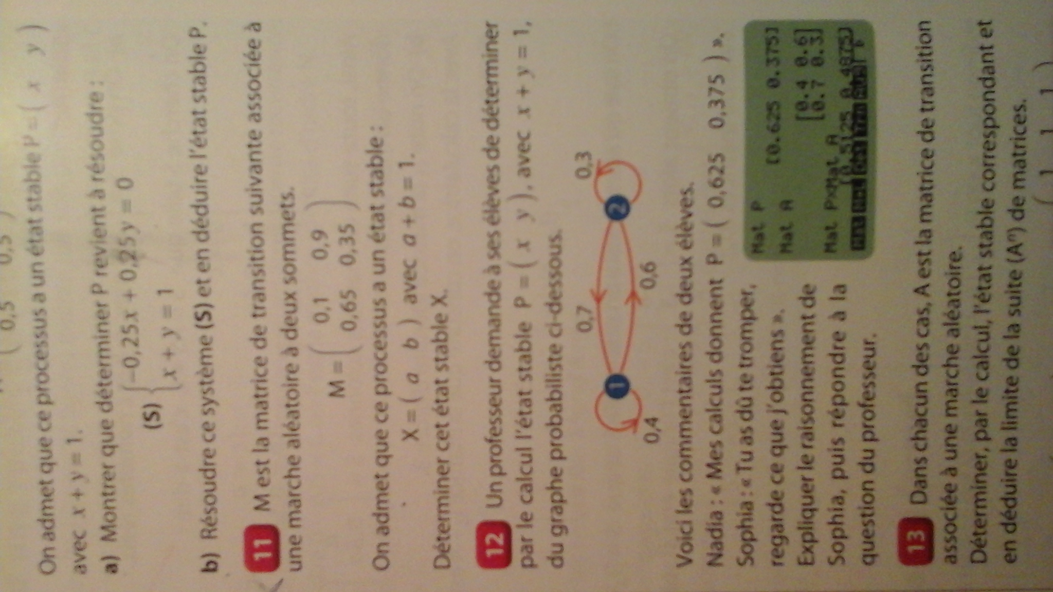 oui c'est ce que j'ai fais et j'ai reussi à faire les exercuces en réalisant des systemes mais les resultats sont vraiment etonnant pour le 11 j'ai X=(0,4194 0,5806) et pour le 12 P=(0,5385 0,4615) mais je ne comprends pas le raisonnement de sophia en plus je ne trouve pas pareil que nadia ni sophia