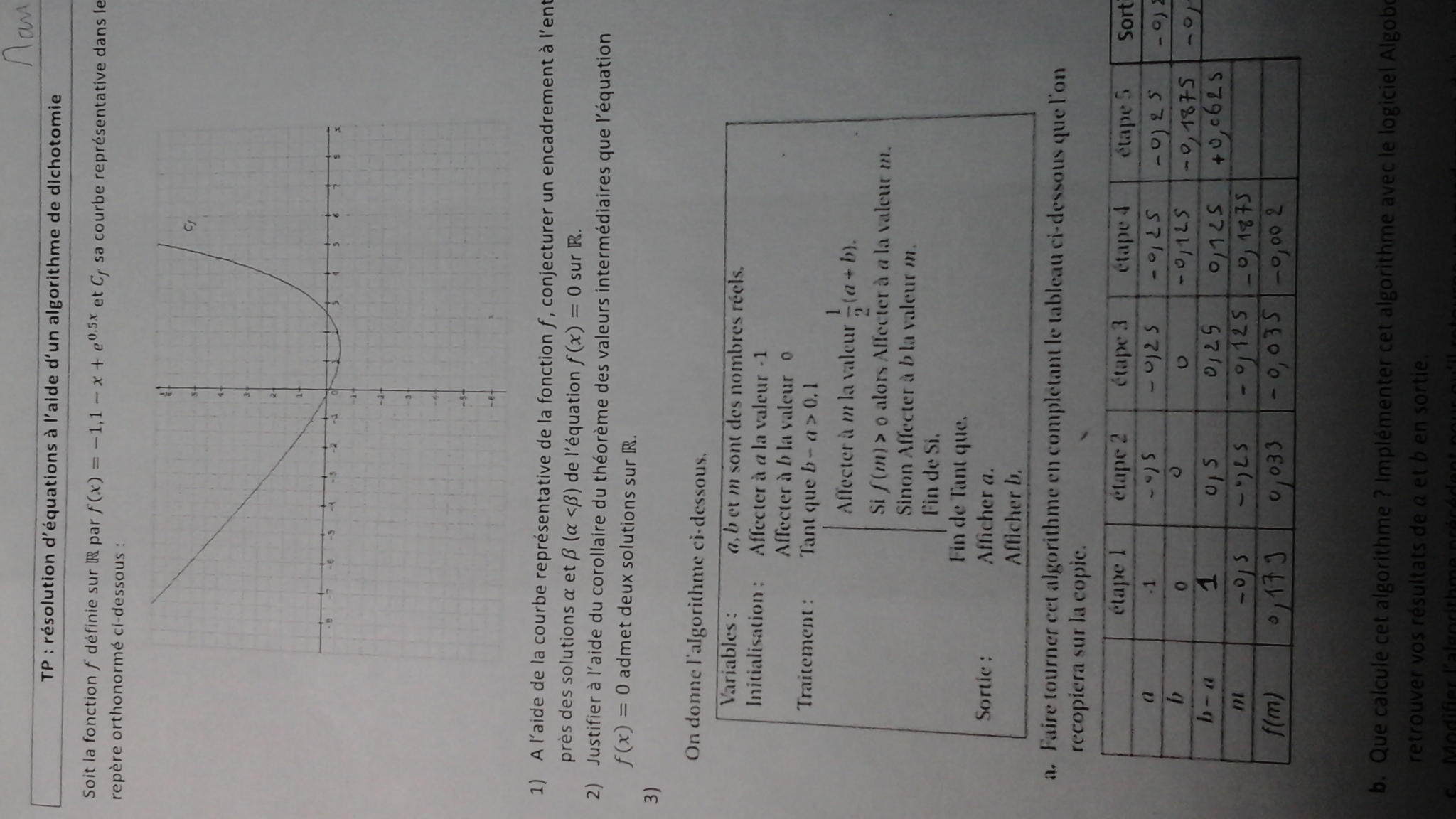Bonjour, j'ai un tp informatique à faire pour vendredi, j'ai fait toutes les questions mais il m'en reste juste une que je trouve très dure à faire, c'est la question 2, j'ai commencé par le prouver séparément sur [-1;0] puis [2;3] mais je n'arrive pas à déterminer le signe de la dérivée de f (x) où j'ai f'(x)=-1+0,5exp(0,5x), je n'arrive pas à faire le tableau de signe pouvez vous m'expliquer svp ?