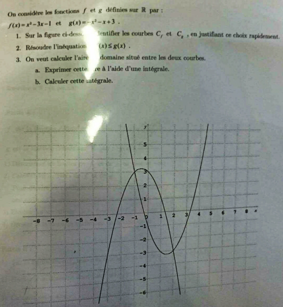 \(\int_{-1}^{2}(g-f)(x) dx= \int_{-1}^{2}2(-x²+x+2)dx b) Ta primitive est bonne, on a bien \int_{-1}^{2}(g-f)(x) dx=\) [2(\(\frac{-x^3}{3}\)+\(\frac{x^2}{2}\)+2x)] \(_{1}^{-2}\) en changeant a et b.