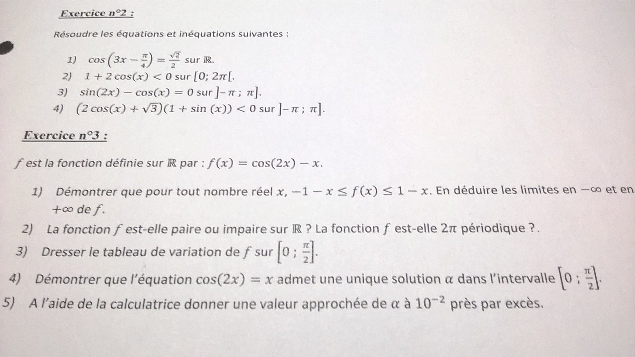 Pour l'autre exercice, il faut que tu te serves de l'inégalité sur le cosinus : pour tout réel \(X\), \({-1}\leq\cos(X)\leq 1\) donc a fortiori pour tout réel \(x\), \({-1}\leq\cos(2x)\leq 1\). Je te laisse terminer ton encadrement.