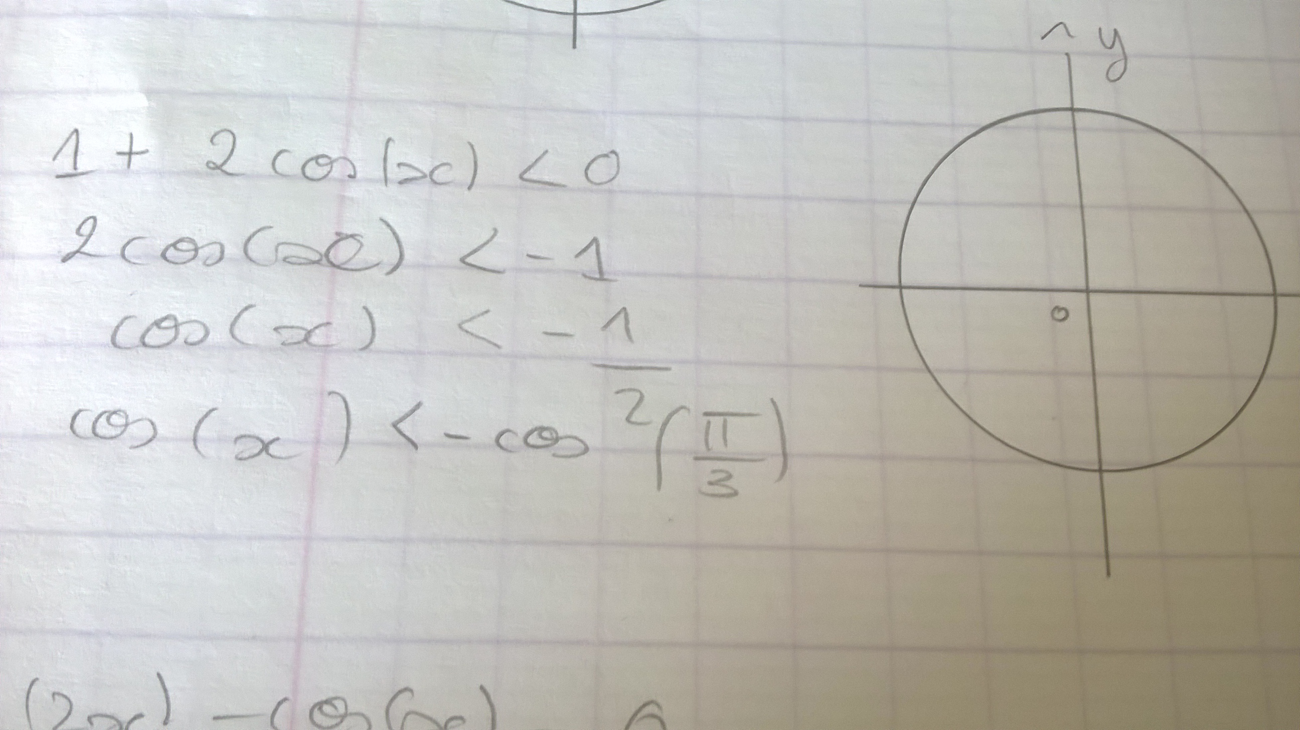 Tu as \(\cos(x)=\frac{-1}{2}\) lorsque \(x=\frac{\pm 2\pi}{3}\). Pour l'inéquation, tu as donc : Bonne conclusion
