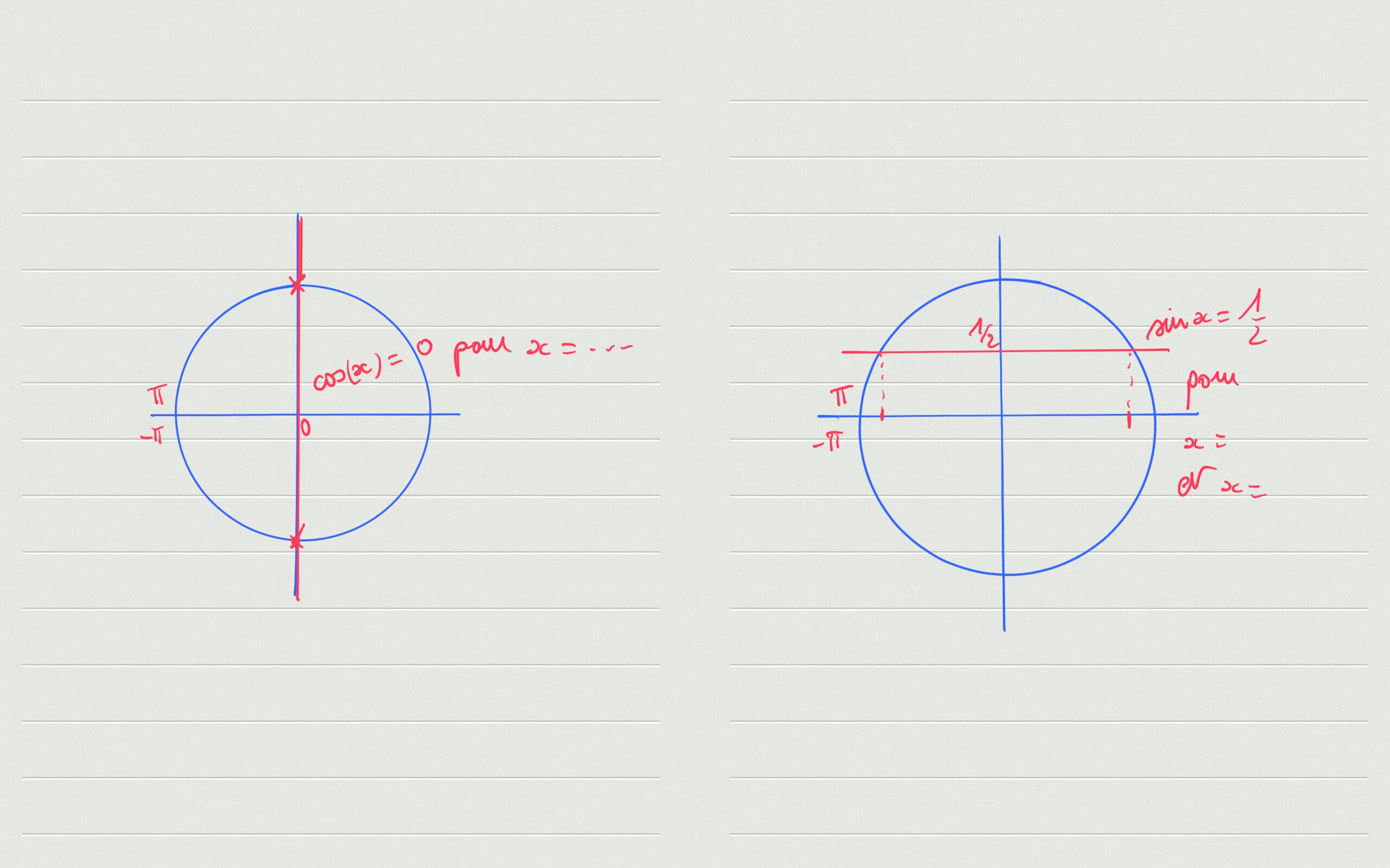 Pour la deuxième équation, on obtient : \(\sin(x)=\frac{1}{2}\) Il faut vraiment que tu te familiarises avec le cercle trigonométrique.