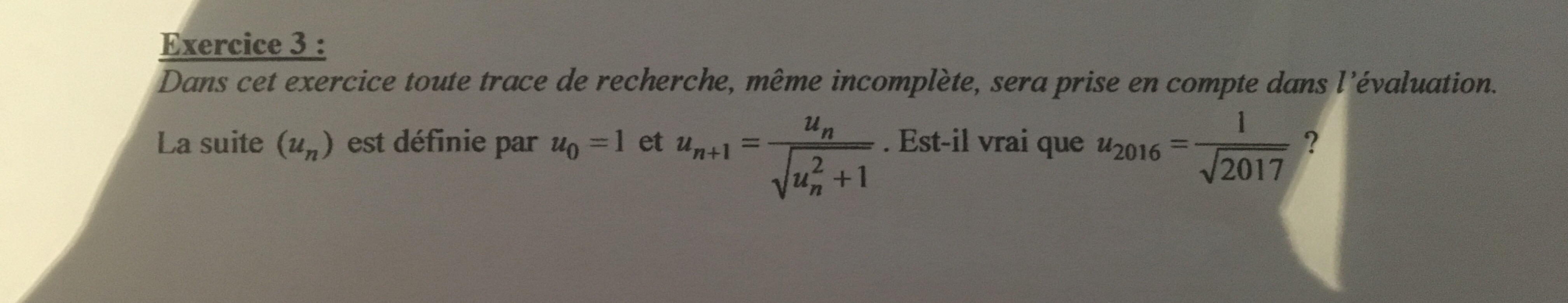 Si tu regardes u\(_{2016}\) donné dans l'exercice, cela ressemble à \(\frac{1}{\sqrt{n+1}}\)