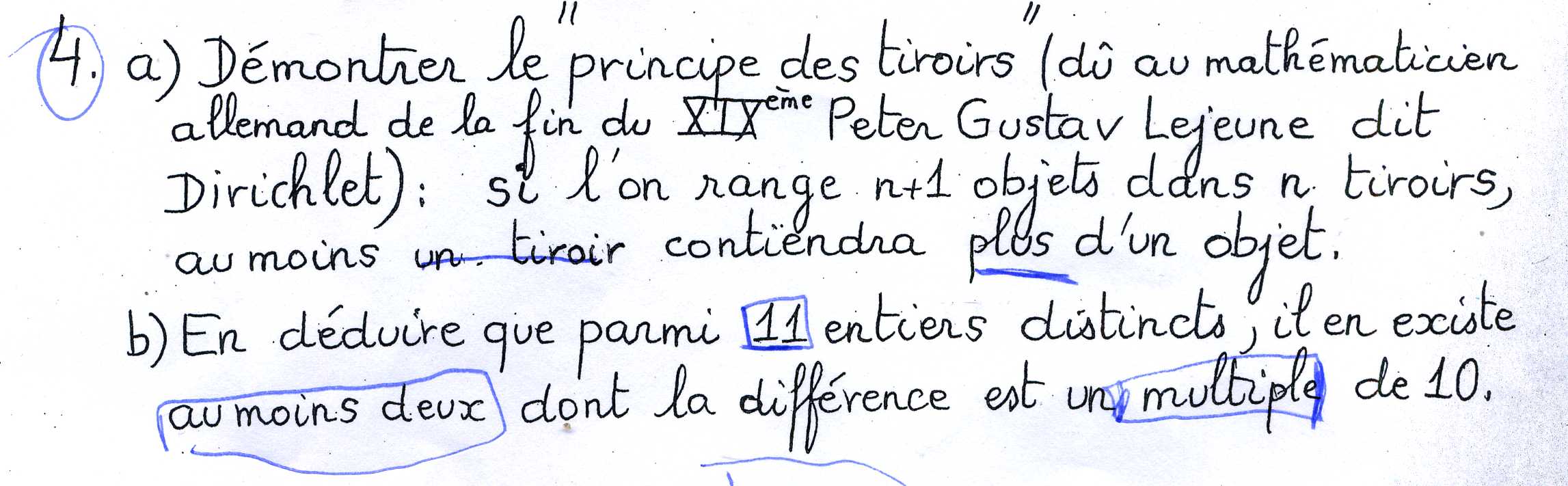 il faut que tu raisonnes sur les tiroirs formés par les chiffres des unités des nombres entiers : il y a dix chiffres des unités possibles donc tu dois placer 11 nombres distincts dans ces dix tiroirs....