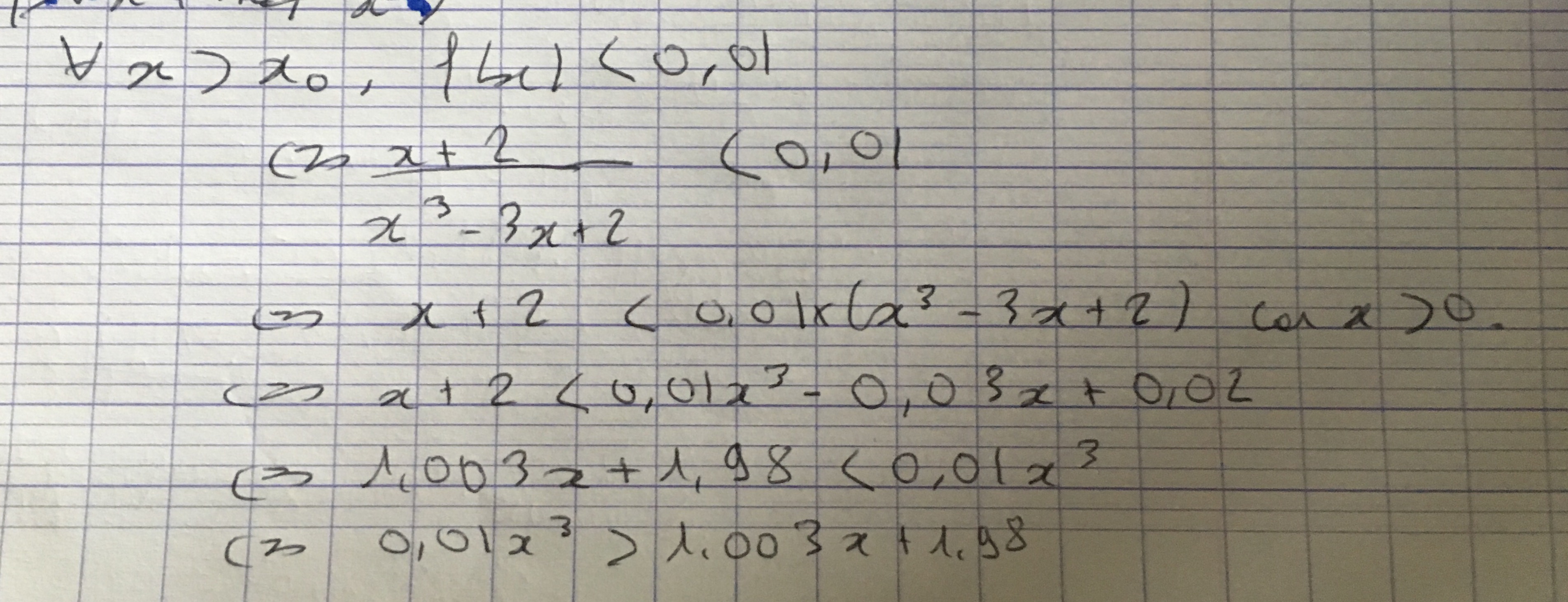 Pour résoudre la question il faut utiliser la factorisation ... \(\frac{x+2}{x^3-3x+2} < 0,01\) <=> \(x+2 < 0,01(x-1)(....)(...)\) car \((x-1)(....)(...) > 0\)