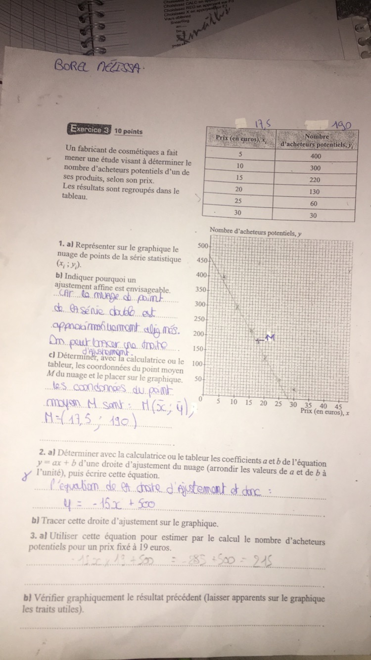JE suis lycéenne en bas pro et j'ai un dm de math à faire pendant les vancances jai bien réussie à faire les première question mais arrivée à la question 2.a) JE bloqué JE n'arrive pas à calculer l'équation ax+b j'ai essayer plusieurs solution mais aucune tombe sur les bons résultats , merci de bien vouloir m'aider.
