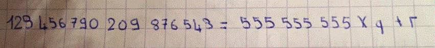 Donc le reste et le quotient de la division par N par 222 222 222 est r =111 111 111 et q = 555 555 555 .
