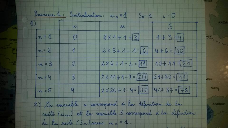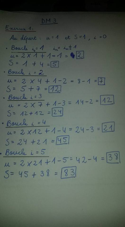 J'ai un devoir sur les suites numériques à rendre mercredi et je suis bloqué au tout début. Je vous le joins. Un algorithme nous est donné et il faut le faire tourner à la main, mais je ne comprend pas vraiment son fonctionnement et la signification de i et de S. J'aurais besoin d'un éclaircissement. Je ne sais pas aussi s'il suffit de répondre à la question 2 par "La variable u correspond à la définition de la suite (un) et la variable S correspond à la définition de la suite (Sn). Je vous joins également ce que j'ai fait pour l'instant. Merci d'avance.