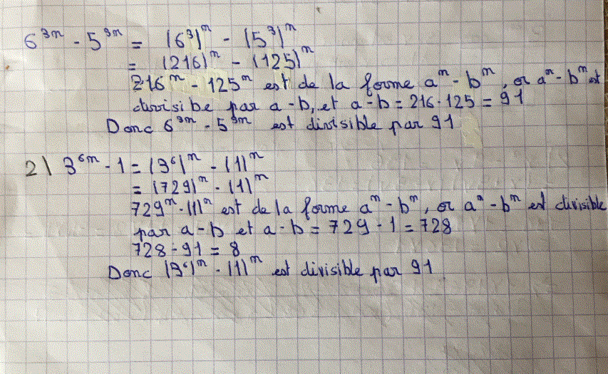 J'ai donc utilisé vos conseils ( cf photo) mais je sais pas comment continuer pour montrer que cela est divisible par 91 ...