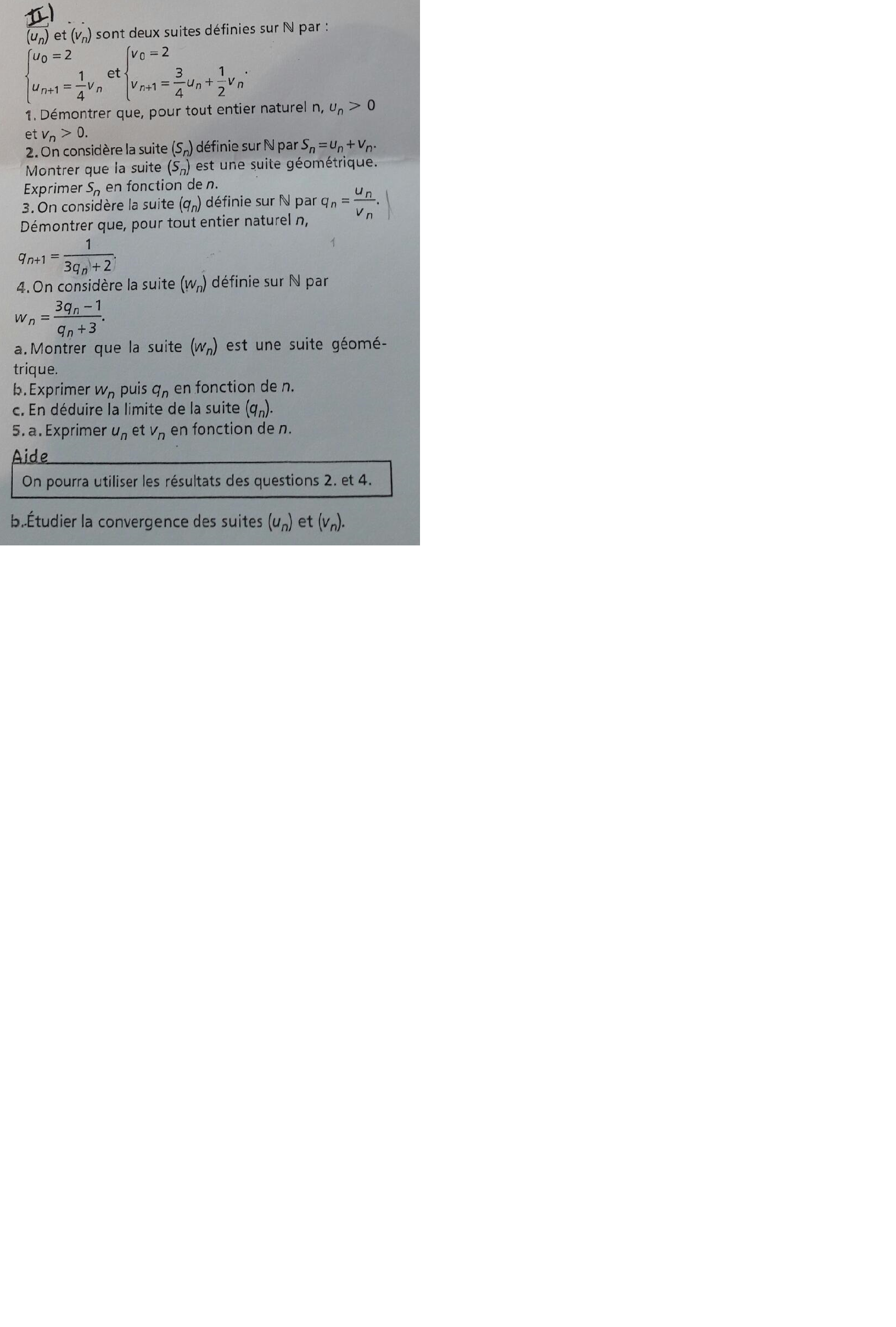 Après plusieurs calculs, il se peut qu'il y ait probablement une erreur dans l'énoncé de l'exercice et que ce soit \(w_n = \frac{3q_n-1}{q_n+1}\).