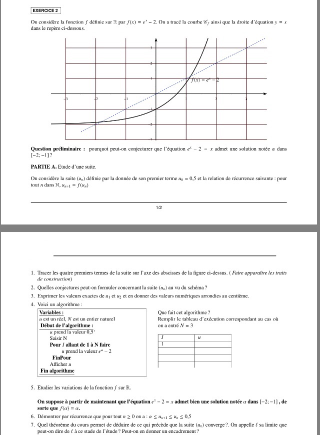 Bonjour je suis en Terminale S et je dois faire un DM de maths pour la rentrée sauf que je bloque principalement sur l'algorithme. Les 2 premières questions je pense avoir bon mais l'algo me pose problème. J'ai essayer plusieurs possibilités mais le résultat de chacun me semble pas très convaincant. Pourriez vous m'aider s'il vous plaît ? Merci d'avance !