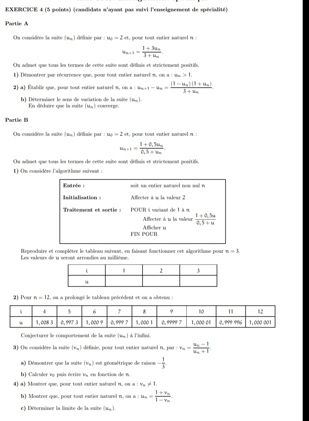 Reproduire et compléter le tableau suivant, en faisant fonctionner cet algorithme pour . Les valeurs de  seront arrondies au millième.
