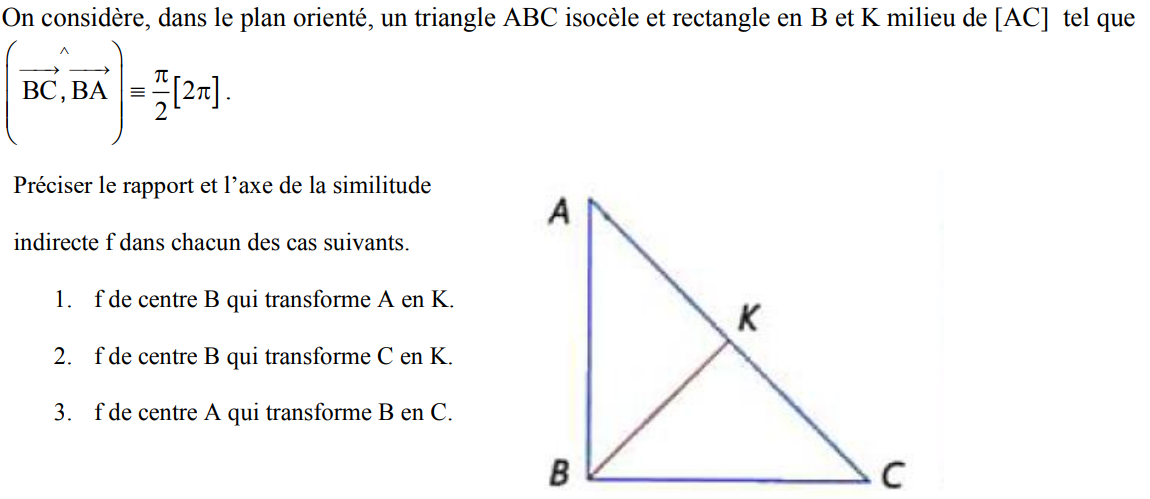 Donc une fois que l'on a établi que le rapport de similitude était différent de 1, on sait que la similitude est la composée d'une homothétie de centre B et d'une réflexion d'axe passant par B : c'est donc la bissectrice de \(\widehat{ABK}\).