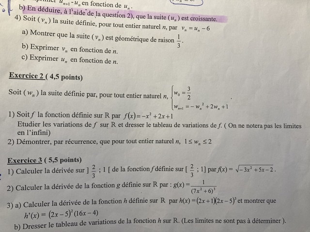Je bloque à la dernière question de l’exercice 2. Je n’arrive pas à démontrer par récurrence car le résultat que je trouve est le suivant : 4< uk+1< 9