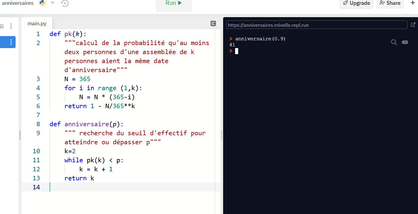 dans replit, tu appuies sur run, puis tu vas dans la console à droite et tu appelles la fonction en tapant anniversaire(0.9) par exemple : Bonne continuation