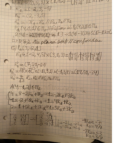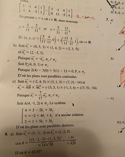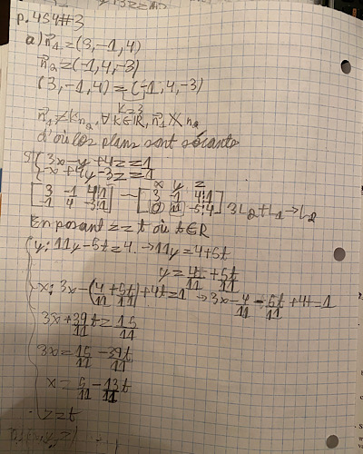 Pour l’exercice 3) a) je rencontre de la difficulté pour trouver l’équation vectorielle pcq dans ce cas les plans sont sécants . Merci de votre aide.