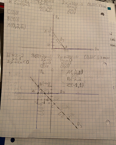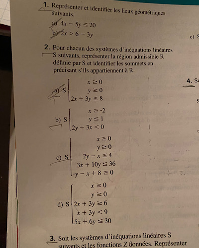 Pour le reste, je te conseille d'écrire les équations de tes droites sous la forme \(y=ax+b\) puis de regarder leur intersection 2 à 2, en résolvant les équations \(ax+b=a'x+b'\).