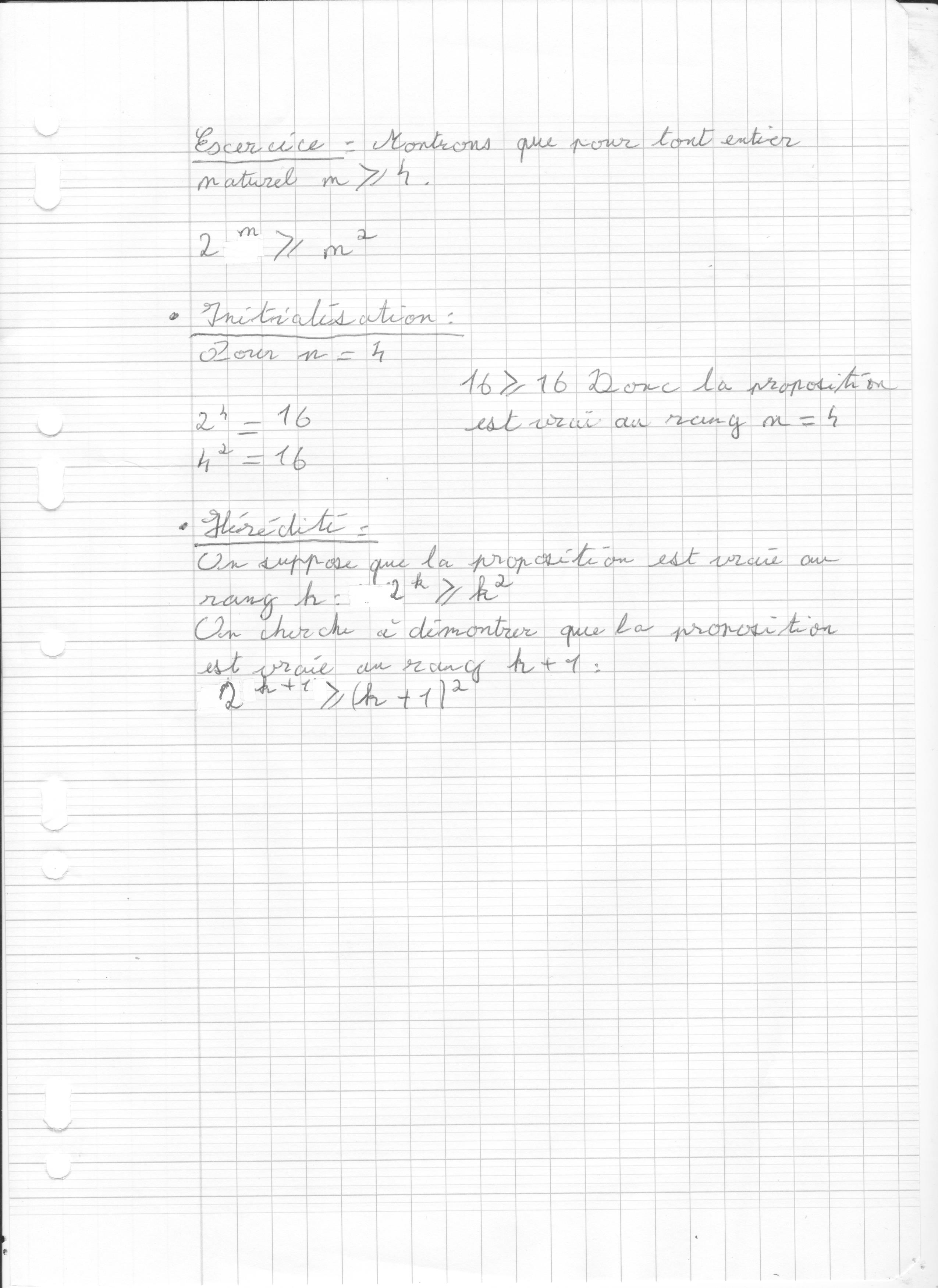 si on suppose pour l'hérédité qu'à un certain rang k>= 4, on a 2^k>= k^2 (hypothèse de récurrence), alors en multipliant tout par 2, on a